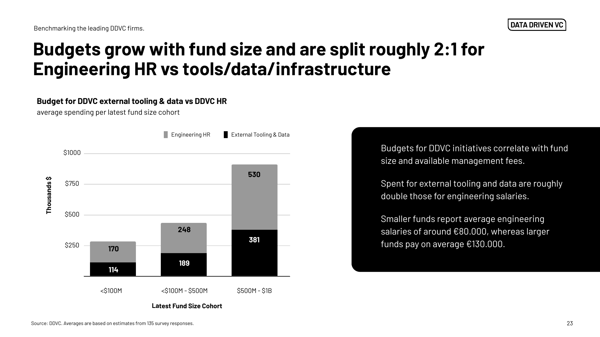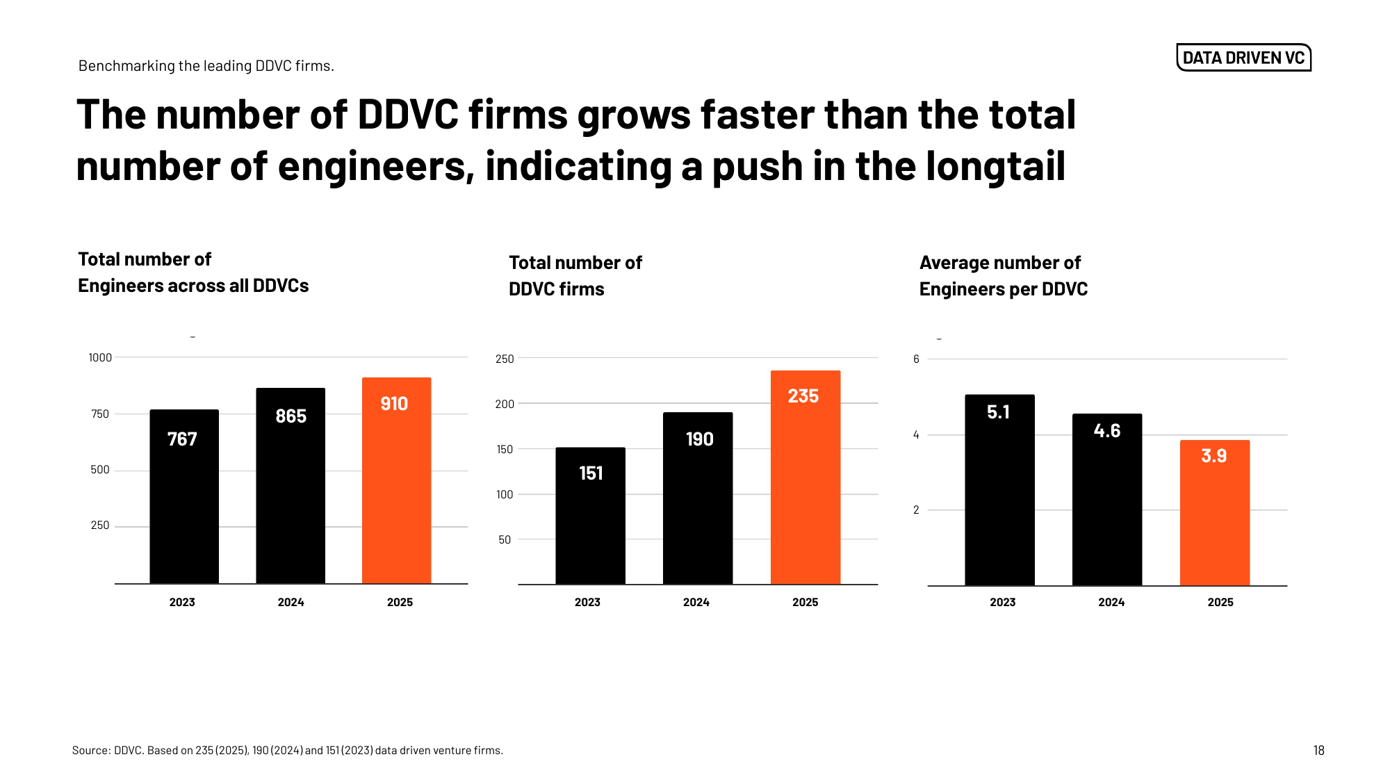 The community grew from 151 to 235 DDVC firms in two years, yet average engineering headcount fell from 5.1 → 3.9. More funds enter the data game, but companies lean on vendors instead of hiring in-house development teams.