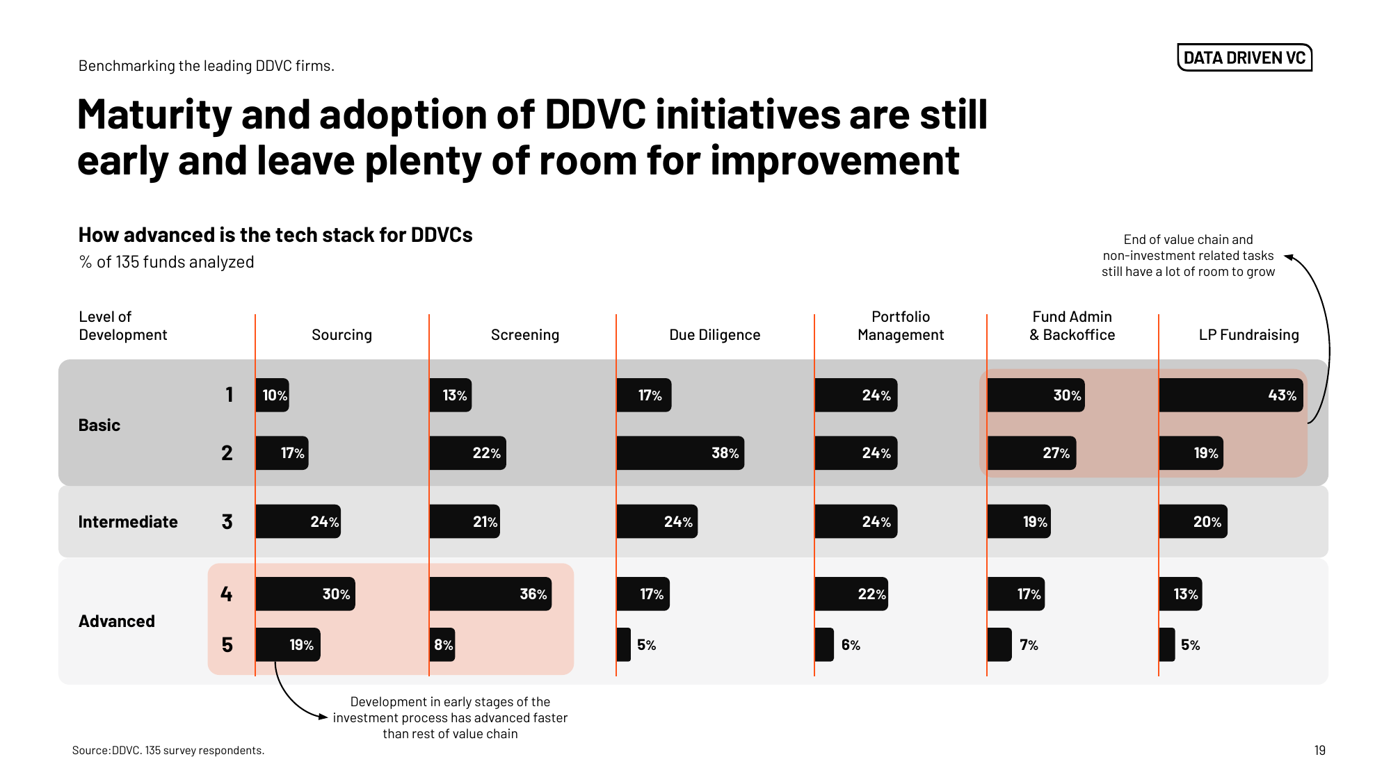Early-stage steps (sourcing and screening) are already advanced for ~50% of DDVCs. Yet, DD, LP reporting, fund administration, and portfolio operations remain “basic” for ~70%.