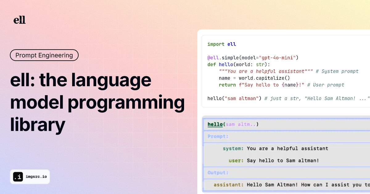 ell is revolutionizing prompt engineering with its lightweight, function-based approach to language model programming. Founded in 2024 by William Guss, a former research scientist at OpenAI, ell has quickly gained traction in the AI development community. While funding details are not publicly disclosed, the project has garnered significant attention on GitHub and in developer circles. Guss's background includes years of experience building and using language models at OpenAI, bringing valuable expertise to ell's design. The library treats prompts as programs rather than simple strings, enabling developers to create discrete subroutines called Language Model Programs (LMPs). This innovative approach allows for cleaner interfaces and more efficient prompt optimization.