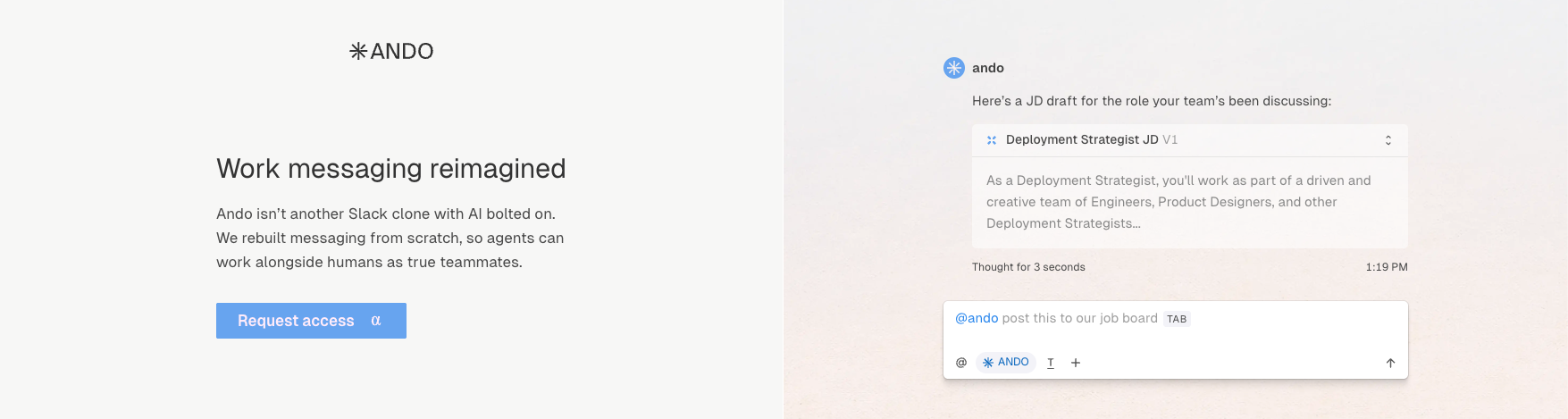 Ando, based in SF, California, is innovating work messaging platforms by integrating AI agents as actual teammates. This approach aims to provide agents with the context, access, and UI primitives necessary for enhancing human productivity. Team: 14 employees (+200% 6m, 2 recent hires). Founded by Sara Du (Harvard University, Y Combinator W20, ex-Alloy). Ando's development of a messaging platform for humans and AI agents to work collaboratively positions it as a pioneer in the Information Technology, Software, and Mobile Platforms sectors.