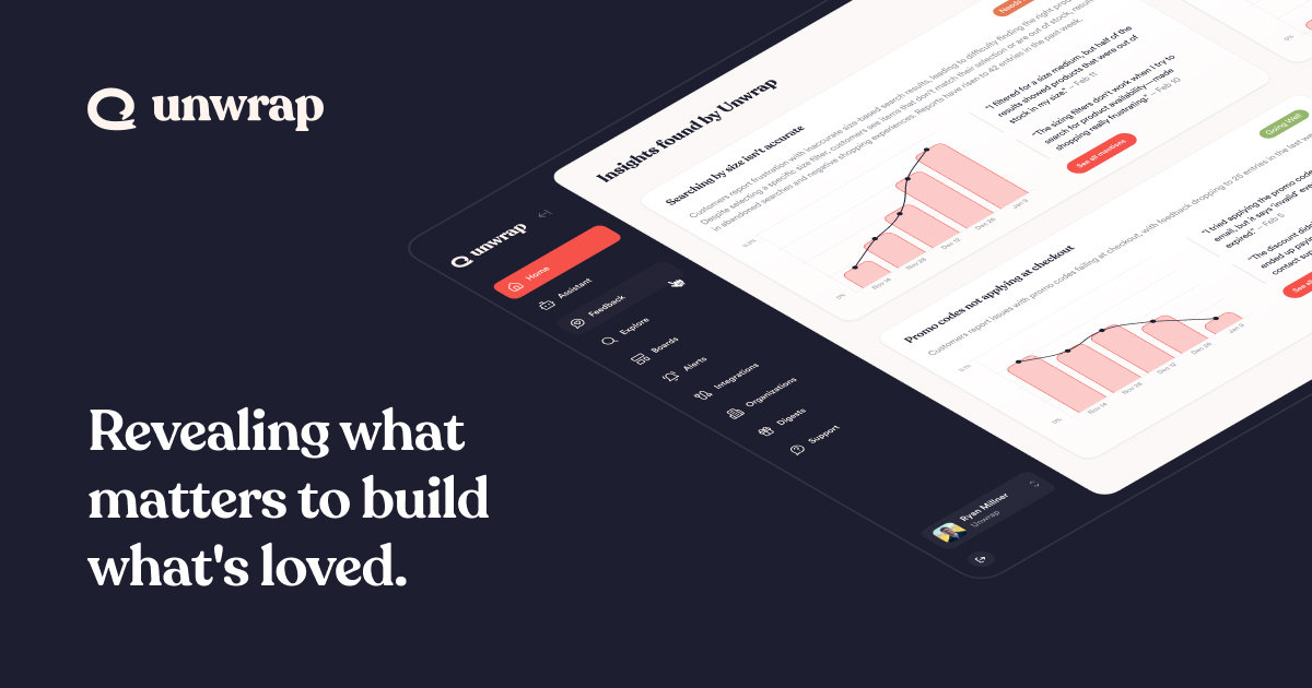 Unwrap.ai Santa Barbara-based redefines user-builder communication with its AI-powered platform that proactively surfaces actionable insights for product and CX teams. Offers AI, Feedback Analytics, Customer Insights, Product Development, Data Aggregation. Raised $15.2M (2 rounds), latest: $12M Series A (Jan 2025). Team: 16 employees (+6.7% 6m, 1 recent hire), 12.5% eng. Founded by Ivan Bercovich (UC Santa Barbara, UMass Amherst, ex-ChipAgents, ex-Rogo), Ryan Millner (UNSW, Duke, ex-Allen Institute for AI (AI2), ex-Amazon), Ashwin Singhania (UC Santa Barbara, ex-Amazon). Backed by ScOp Venture Capital (James Freedman, Mark Weeks, Scott Coleman), Cercano Management (Brady Zerr, Ryan Gochenaur, CPA, Steven Slover), AI2 Incubator (Emad Elwany, Vu Ha, Bryan Hale), Scale Venture Partners (Joan DeGennaro, Lisa Gaston, Laura Sebastiani); partner: Rory O'Driscoll (Scale Venture Partners). Strong funding, diverse founding team, strategic investor support position Unwrap.ai as AI-driven customer insights leader.