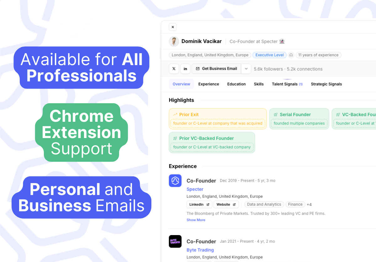 After countless requests from our valued users, we’re thrilled to unveil a high-impact update to our platform—now available not only on our website but also through our convenient Chrome extension. You can access contact details for all founders and professionals in our company database, people database, talent signals, and strategic signals—all in one place.