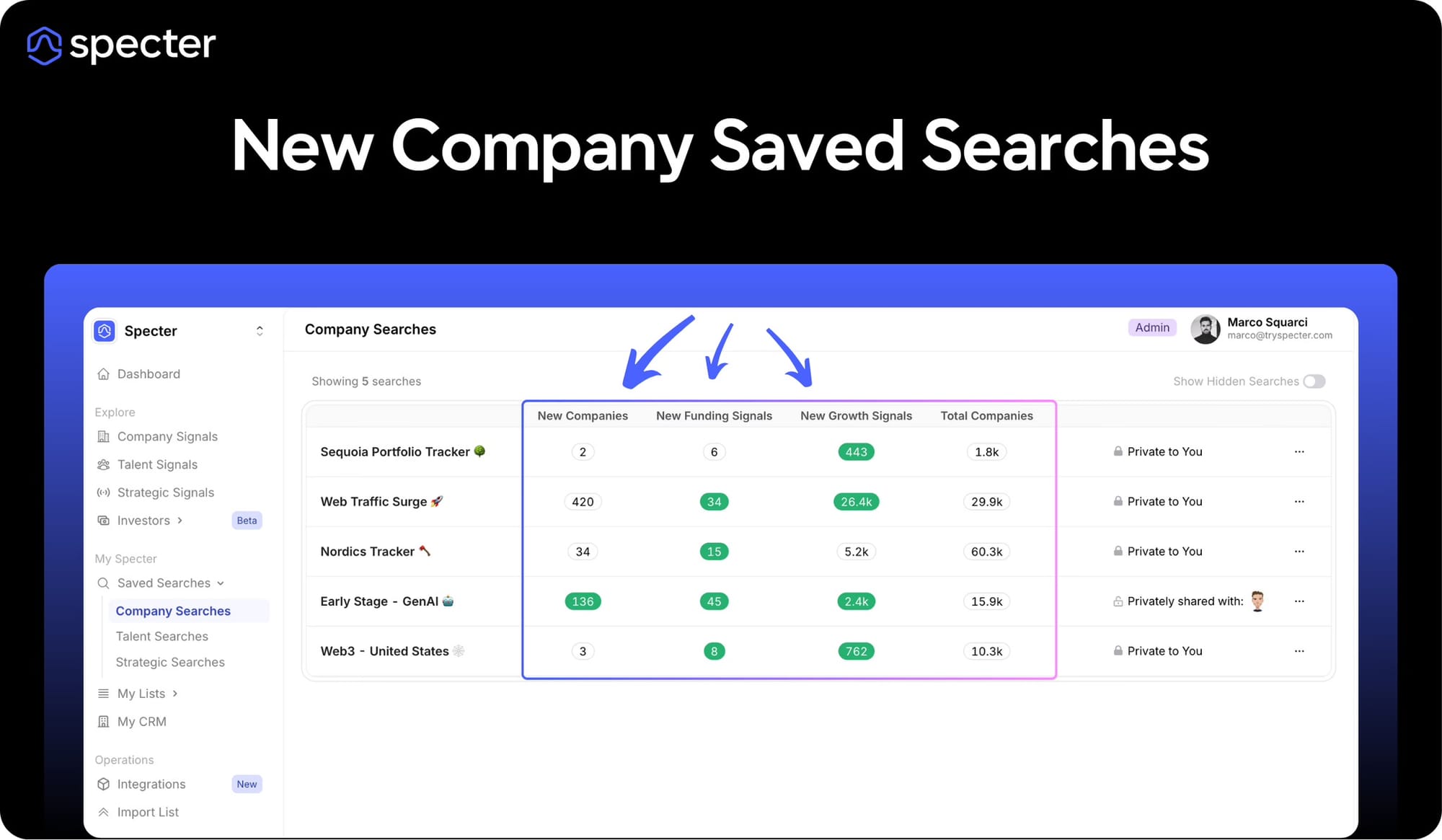 - New Growth Signals Notifications: Monitor companies that demonstrate significant progress or consistent growth in key metrics with New Growth Signals in Saved Searches.
