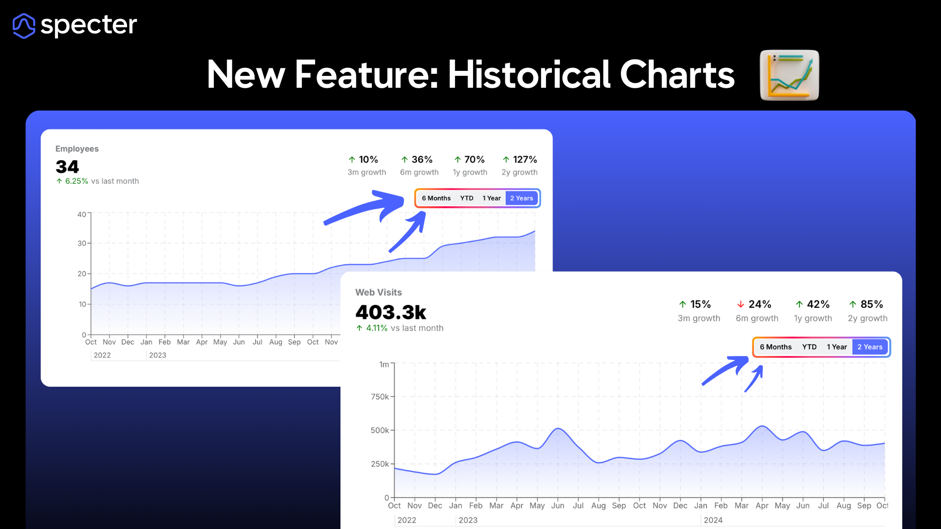 We're excited to announce a long-awaited update to our Historical Charts on Specter! You now have access to two full years of historical data for key metrics—enabling deeper trend analysis, uncovering seasonal patterns, and providing stronger context to validate growth consistency and benchmark companies over time.