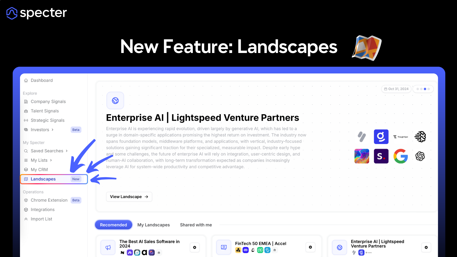 Specter’s new market mapping tool empowers you to analyze industries, market segments, or geographic regions like never before. Whether you use our expertly Recommended Landscapes or design your own, this feature puts actionable insights at your fingertips.