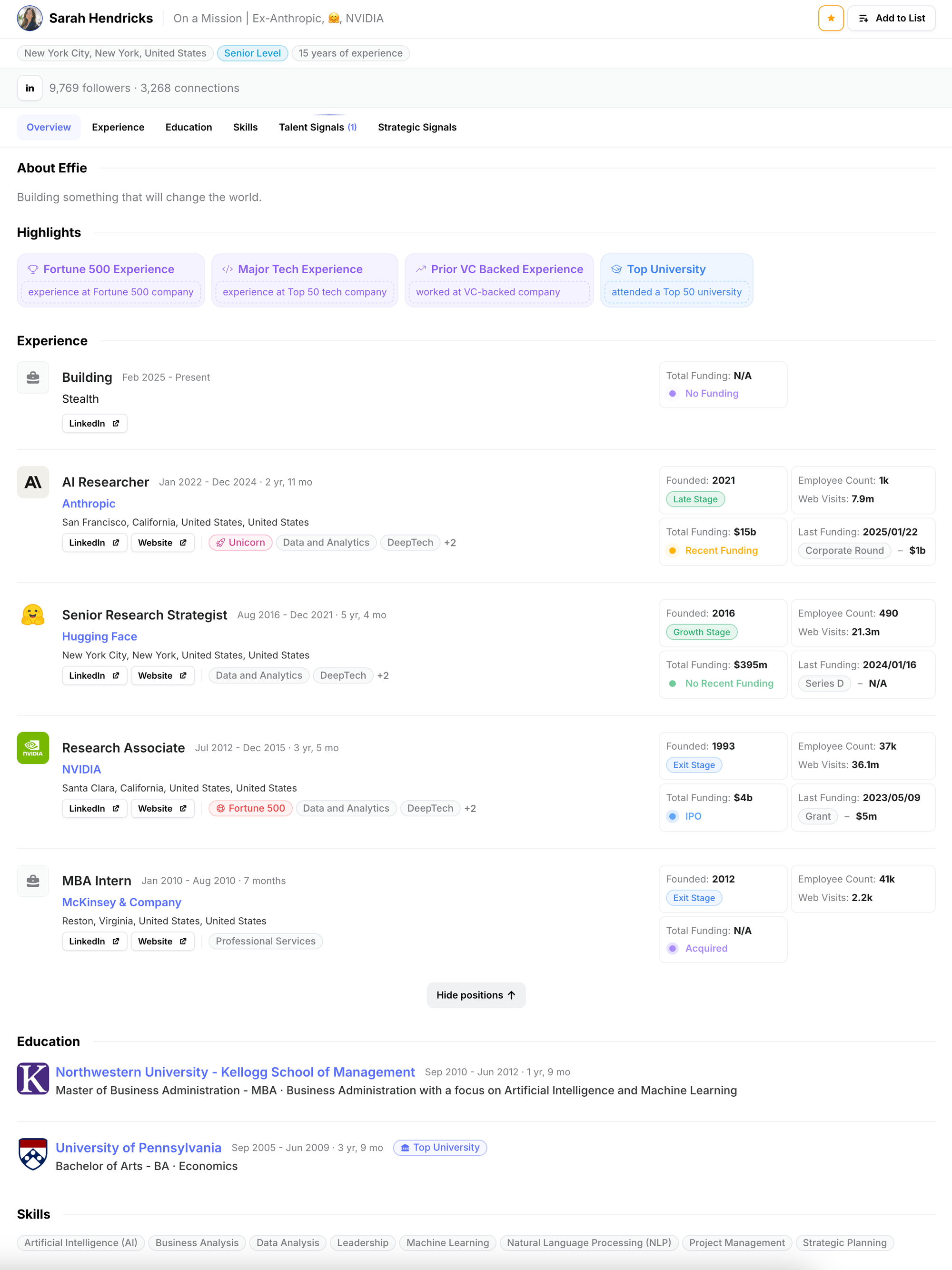 We’ve designed unique, high-impact highlights specifically designed for VC and PE use cases. These include details such as VC-backed experience, previous exits, serial founders, technical expertise, and more. Our profiles are built to uncover the most valuable insights, making it easier for you to identify top talent and emerging trends at a glance.