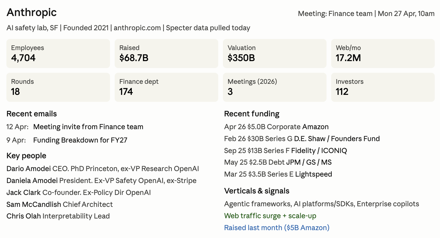 Walking into an intro cold wastes everyone’s time. With Specter connected, your AI builds a full company briefing on demand: recent funding rounds, department breakdowns, web traffic trends, key people, and active signals. It pulls your calendar, inbox, and other connected tools in alongside.