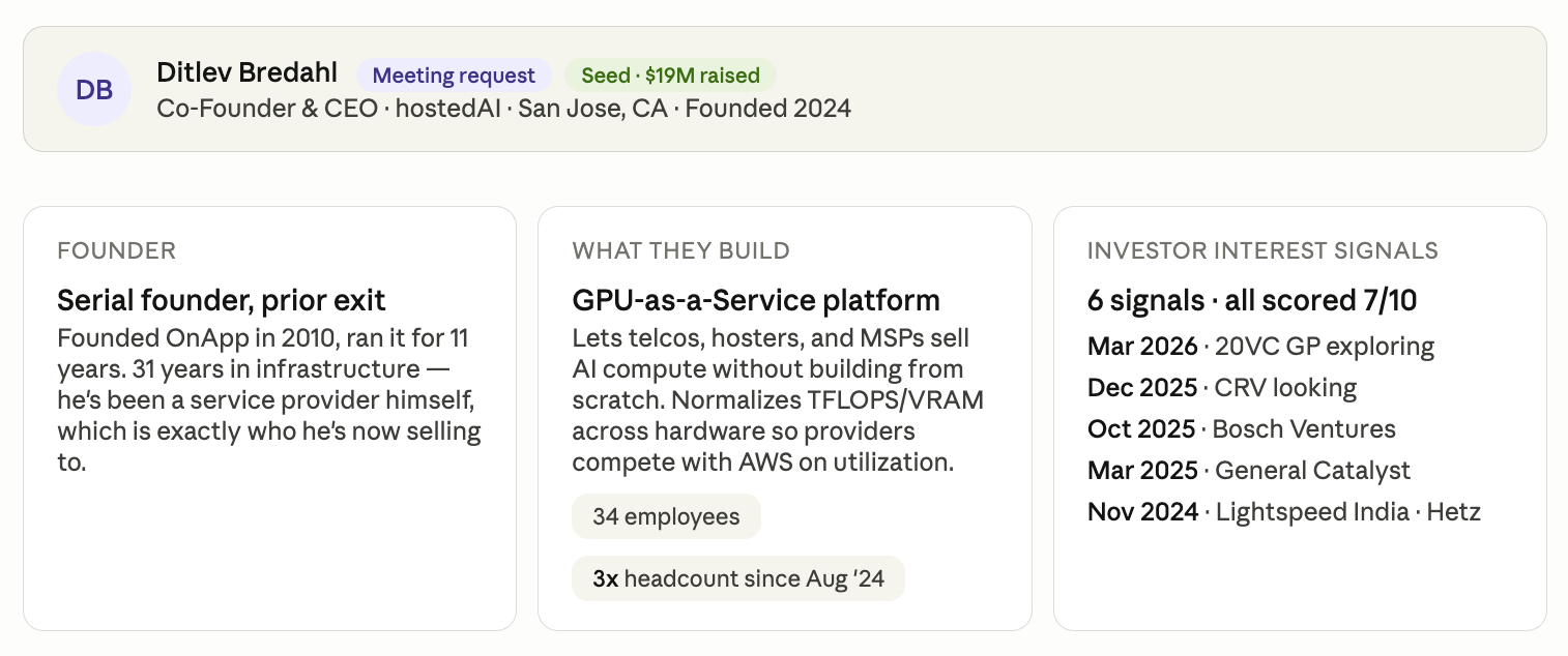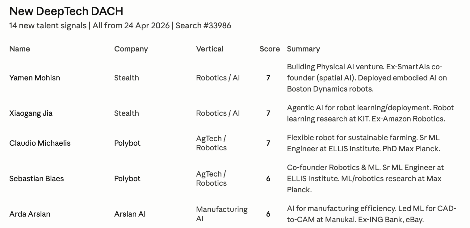 Set it up once and your AI delivers a personalized rundown of what’s new since you last looked. New stealth AI founders. A portfolio competitor raising quietly. A senior hire at a company you’re tracking. The signals come to you, filtered by the searches you already built.