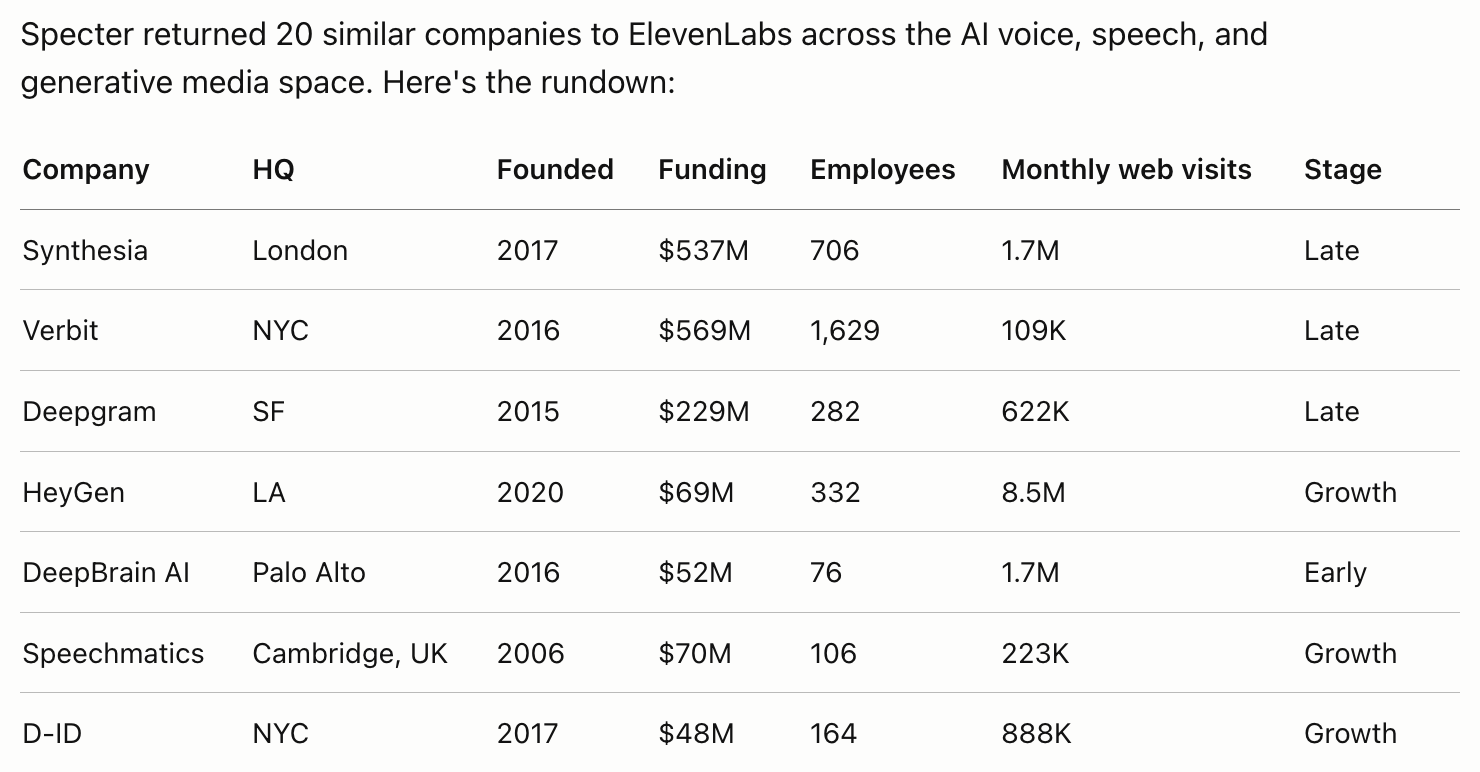 Ask your AI to break down the deck alongside Specter data and you get a structured view of who’s building, how fast they’re growing and who else is already paying attention.