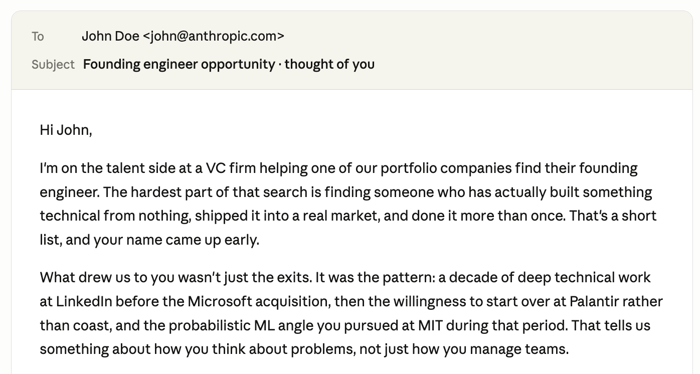 Ask it to draft outreach for a VP Engineering hire at a portfolio company and it layers in the candidate’s actual background, previous companies, and technical depth. Every message reads like you did the homework.