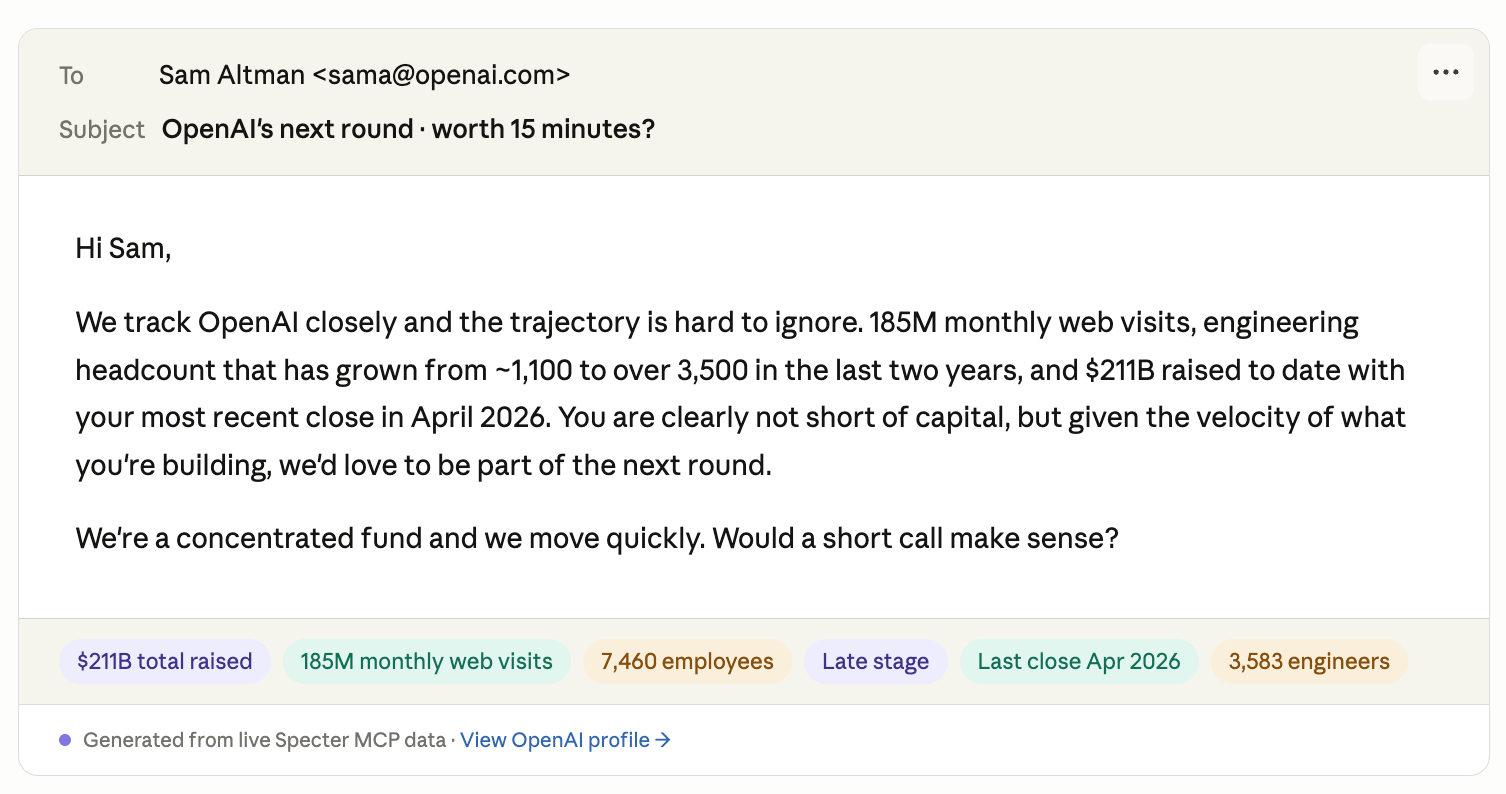 Most outbound runs across two tools: research in one, draft in another. Specter MCP collapses both into a single conversation.