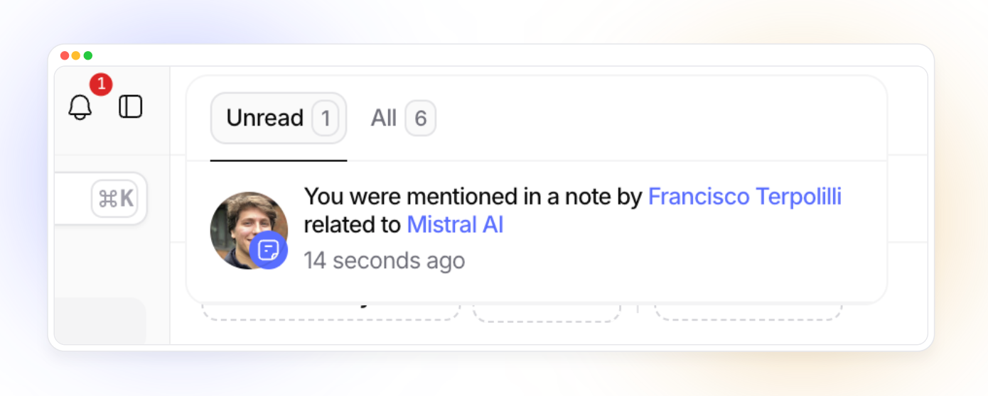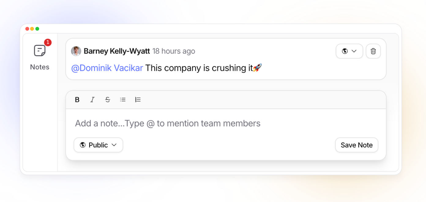 The conversation stays anchored to the company — visible, searchable, and part of your team’s shared intelligence.