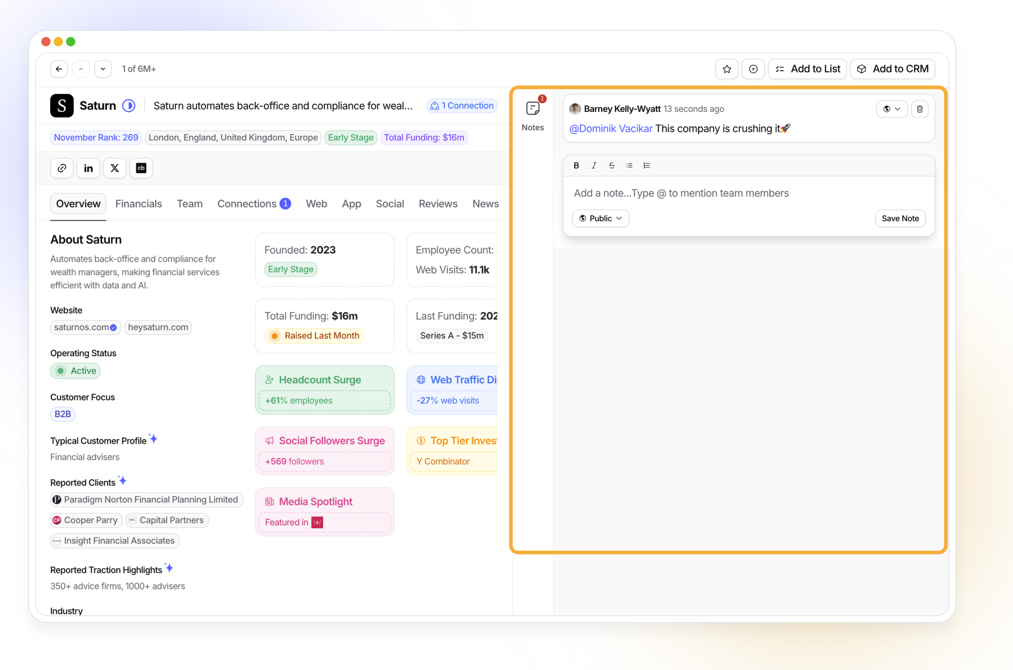 Notes let you attach those moments of context directly to any company profile in Specter. No switching tools, no scattered links — every thought stays where the data lives.