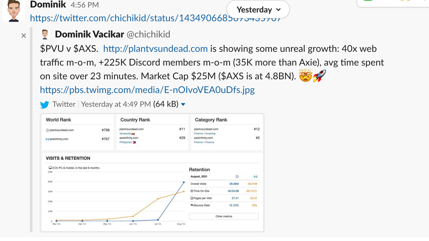 Plant vs Undead (LATAM, 2021) is a multiplayer tower defence game where your plants are also your real asset. PvU is growing faster than Axie Infinity and is already at 40 Million monthly web visits 🤯.